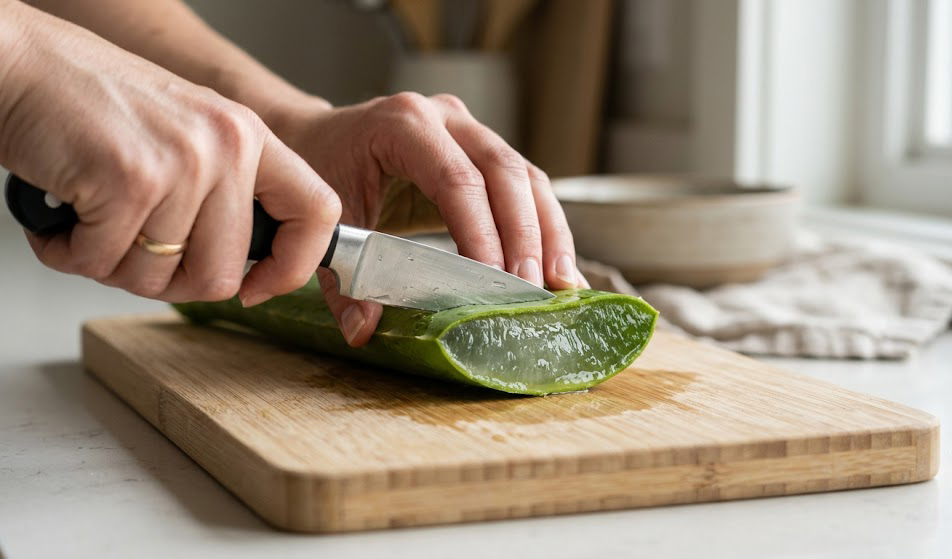 Trim the edges, remove the outer skin, and rinse the inner gel thoroughly to remove the yellow latex. The clean gel can then be used for juice, skin, or hair applications.