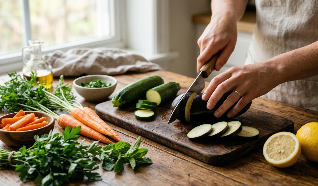 To recreate this at home, the focus should not be on copying dishes exactly, but on building variety from simple vegetables.