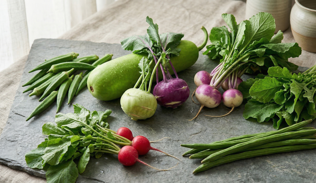 Kohlrabi, bottle gourd, mustard greens, drumstick (moringa), and radish with leaves are commonly available but underutilized by many buyers.